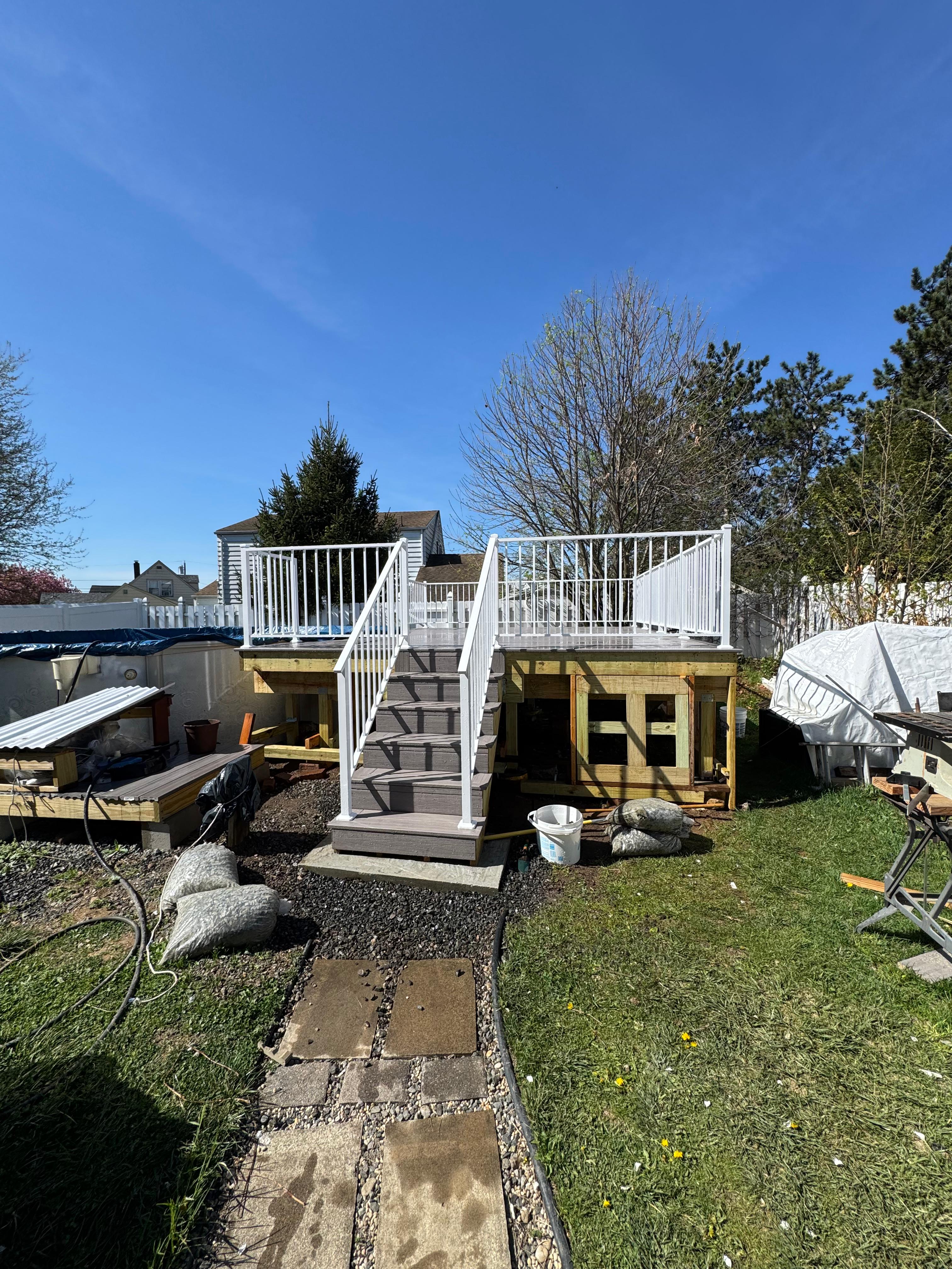 Two-story composite deck build in Wayne NJ with white aluminum rail system, switchback staircase, and pool-side views.