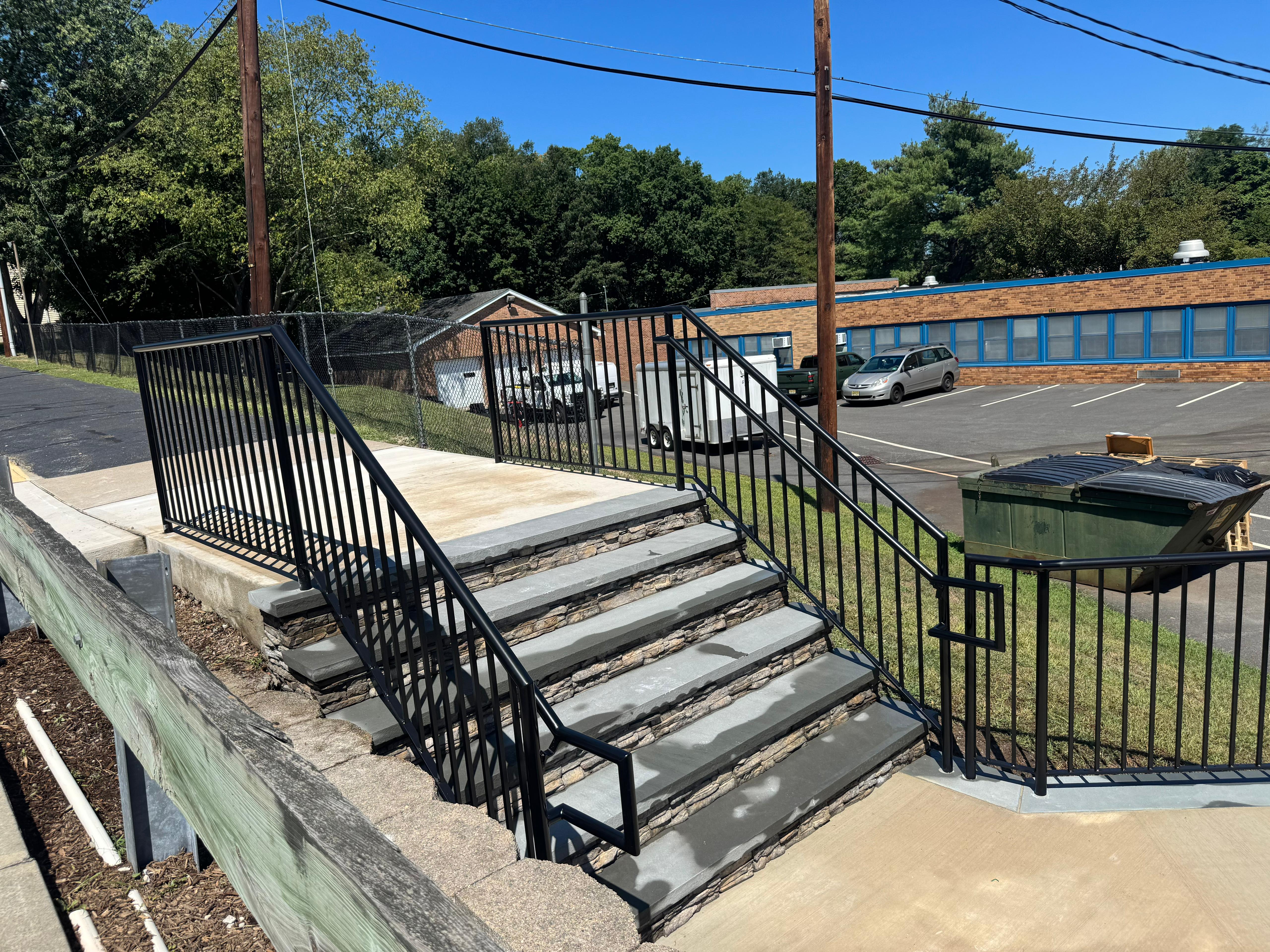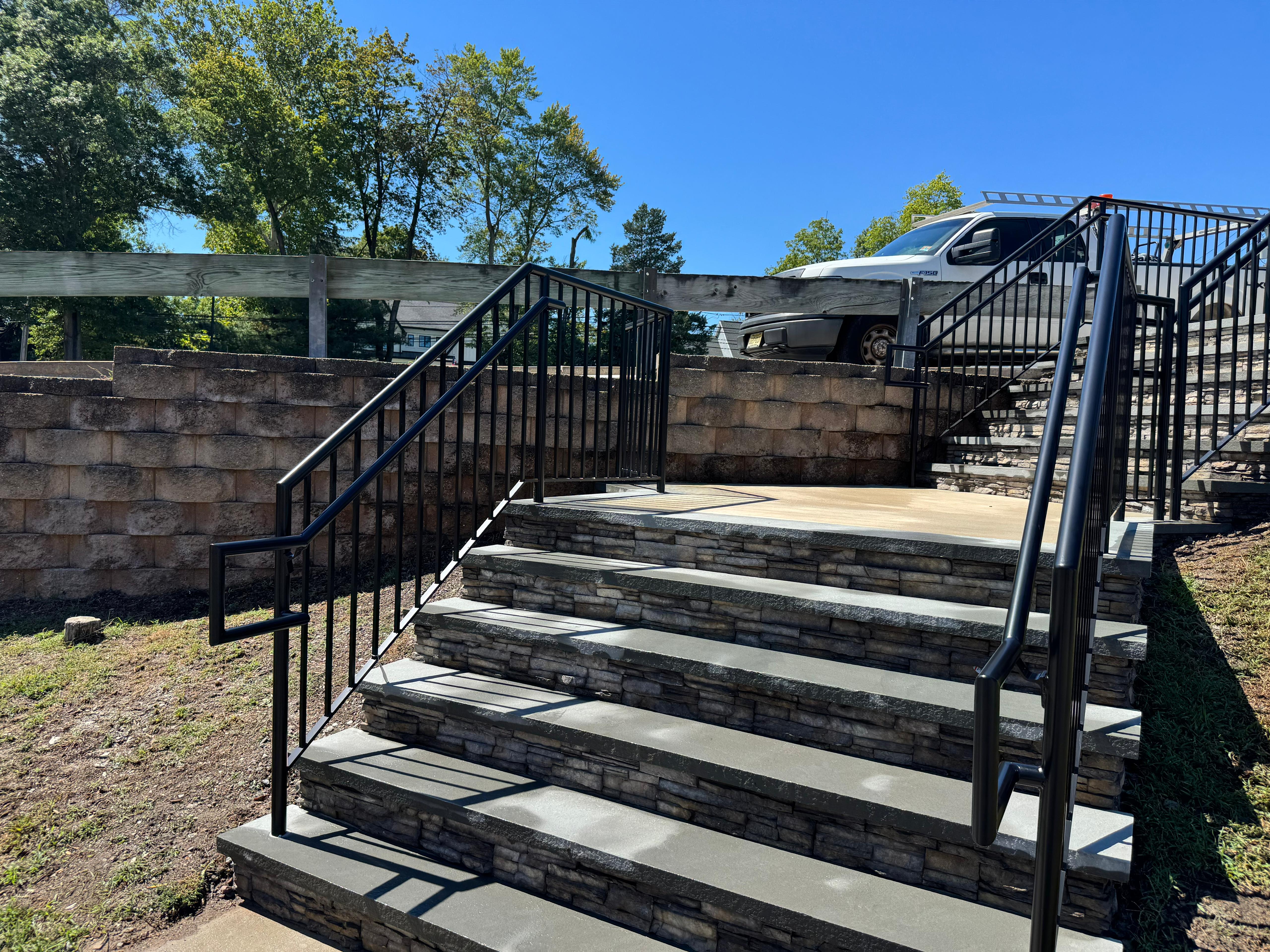 Black aluminum handrails on stone-block park entry stairs in Paterson, NJ. ADA-compliant dual rails with a clean…