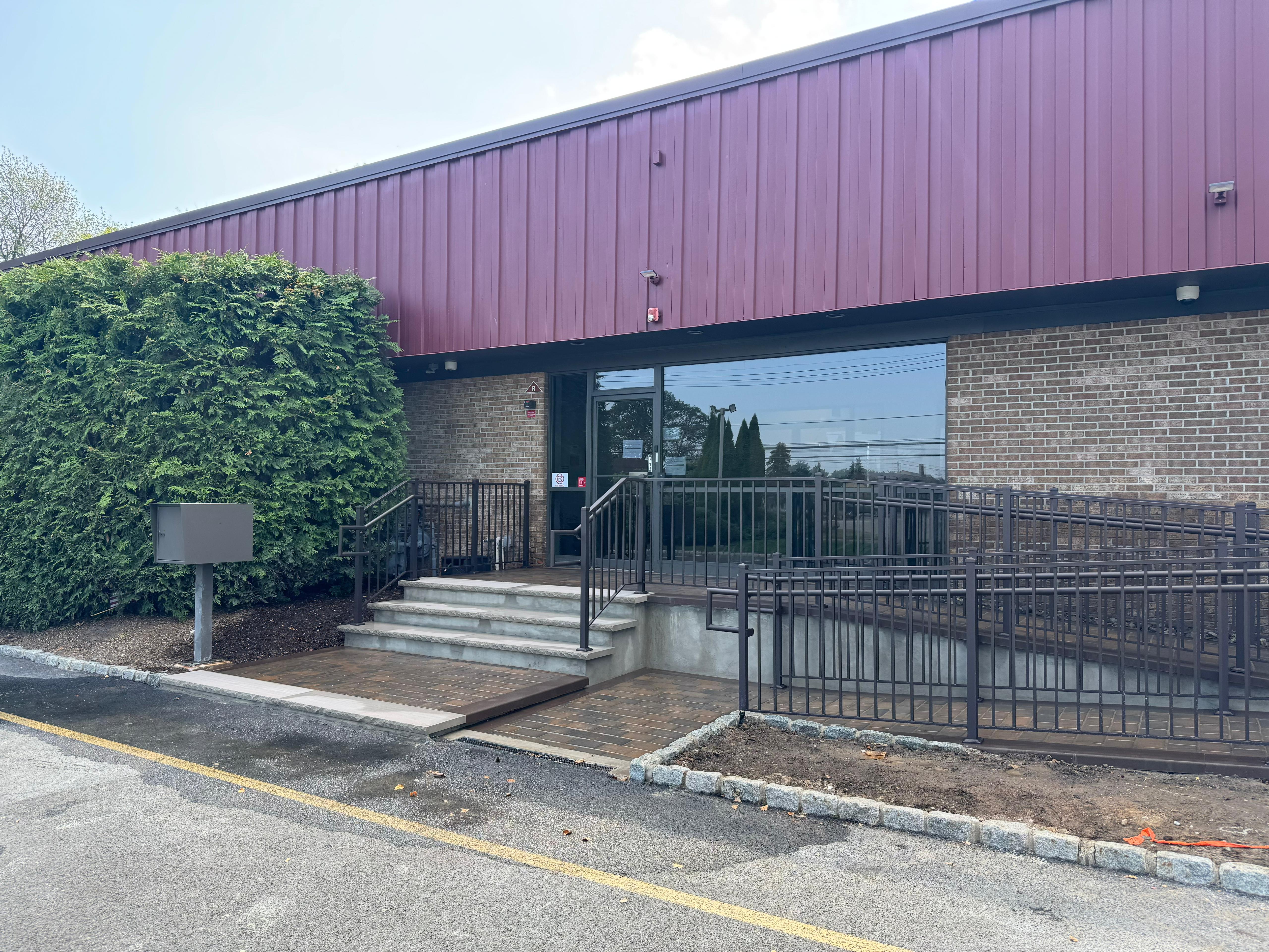 Black aluminum handrails and access gate at a commercial storefront in Fairfield, NJ. Unified powder-coat finish across…