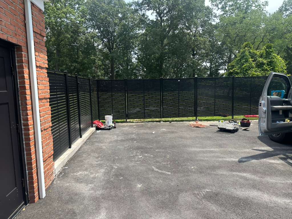 Modern horizontal-slat black aluminum privacy fence installed at a brick home in Passaic, NJ.