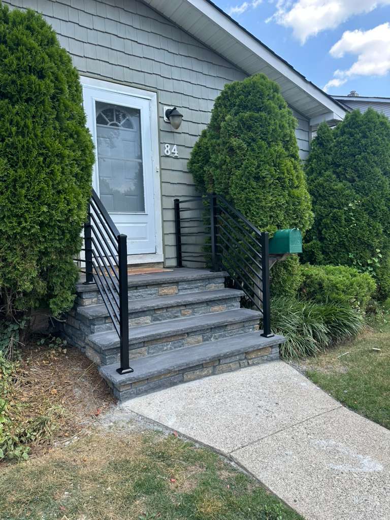 Horizontal-bar black aluminum handrails on a cape cod front step in Little Falls, NJ.